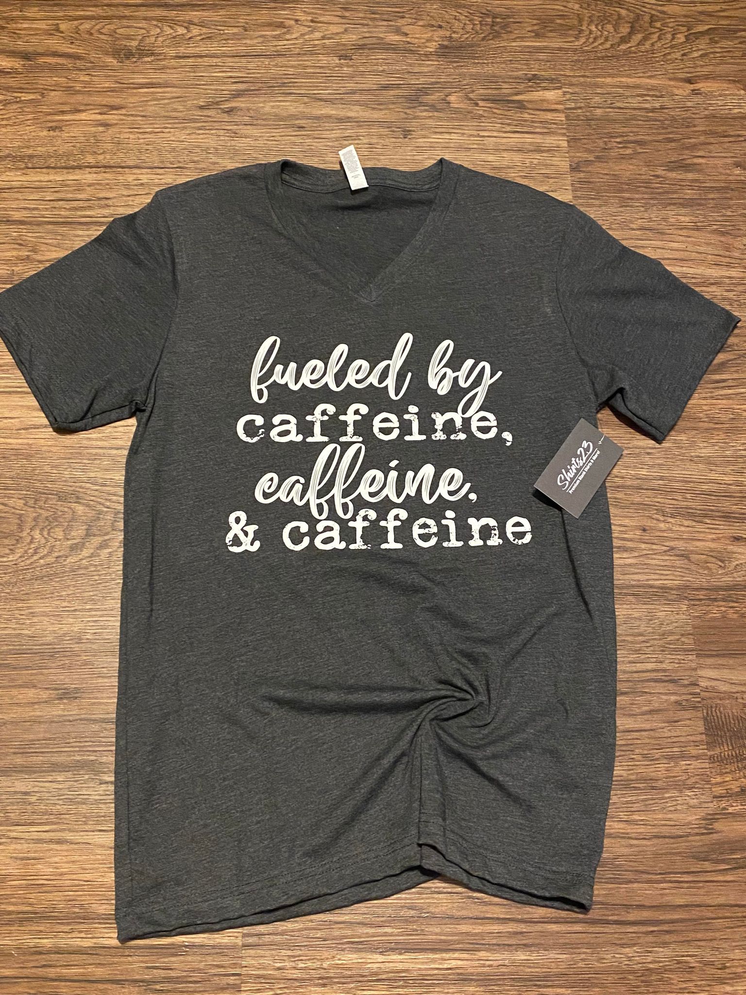 Unisex Bella Canvas V-Neck Soft Shirt in Dark Grey Heather or Black | Fueled by Caffeine, Caffeine and Caffeine | Funny Mom Shirt